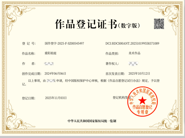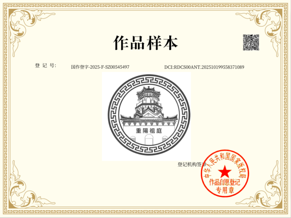 近日,我们的品牌重阳祖庭Logo图案成功通过国家版权局审核,完成登记注册工作。这不仅意味着该Logo的独特设计获得了国家层面的法律保护,更标志着品牌在知识产权布局与品牌形象规范化建设上迈出了关键一步。